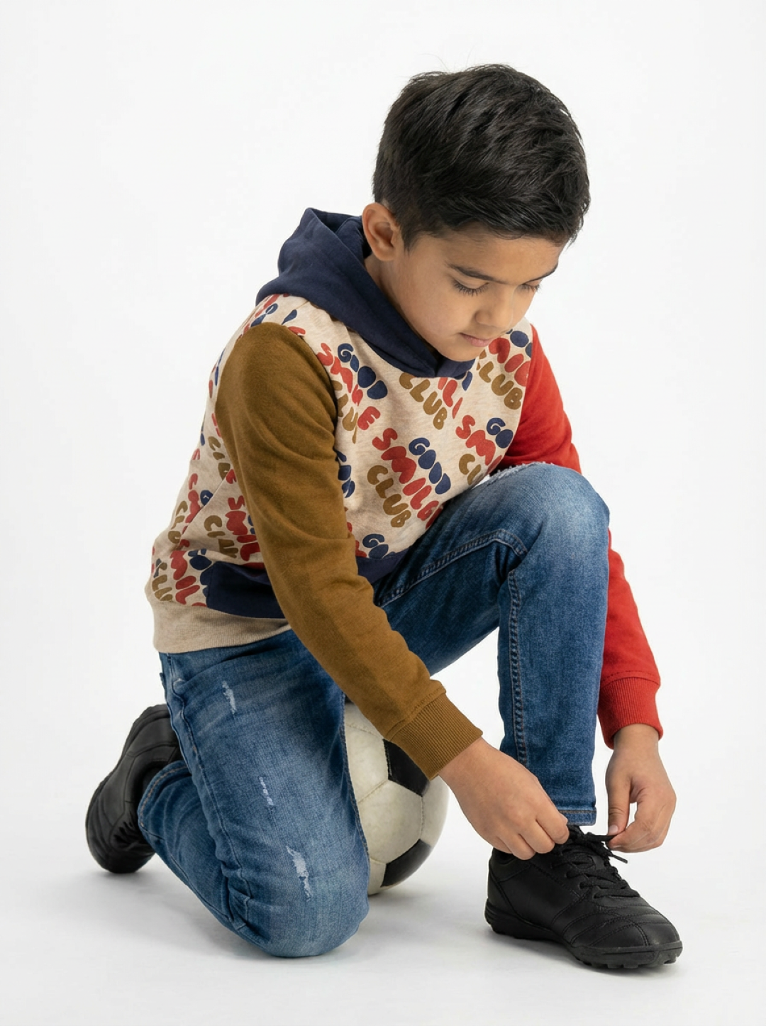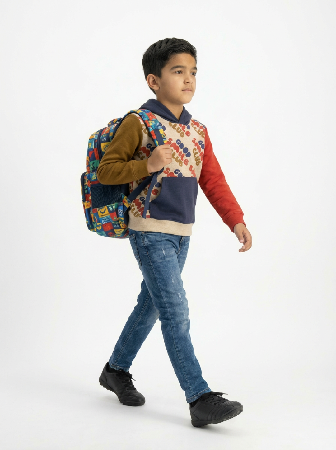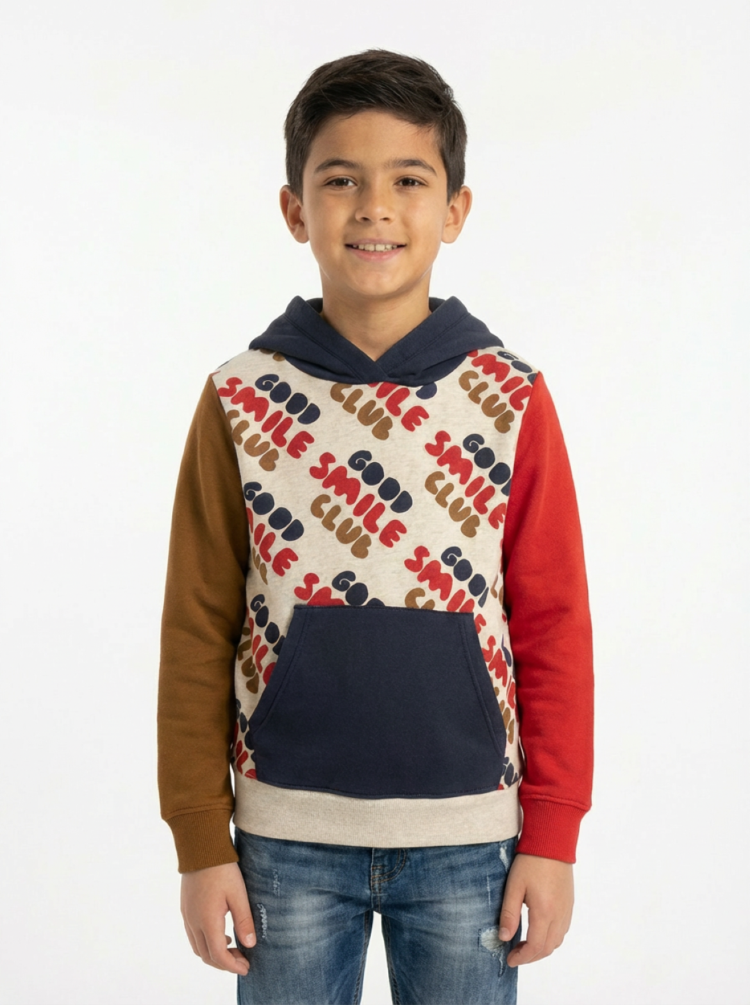 This premium boy’s hoodie features a colourful patchwork design with contrast sleeves and a bold “GOOD SMILE CLUB” print, perfect for toddlers to teens. Made from soft, breathable fabric, it includes a cozy front pocket and durable hood for cooler days. It offers playful style and everyday comfort. Ideal for parents looking for stylish premium toddler and boy’s hoodies for daily outfit, outing and all along indoor wear.